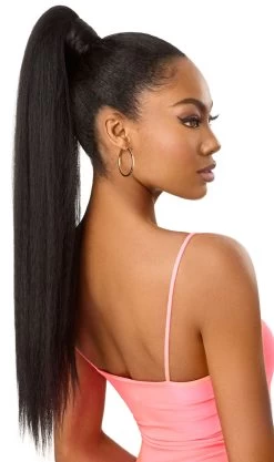 Simply cover your natural pony or bun with this bun and bang combination to